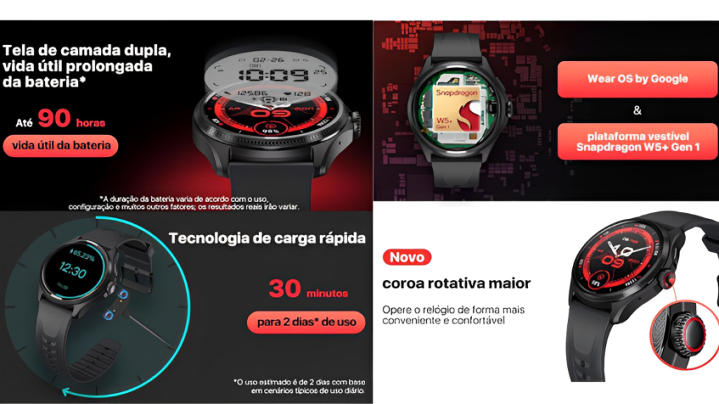 • Processador Snapdragon W5 Plus G1: Potência e eficiência otimizada.